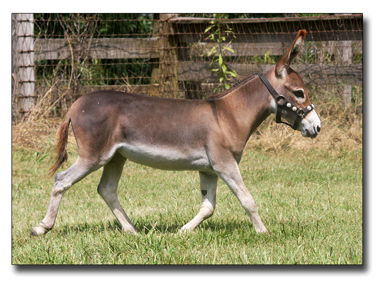 Liza, with very limited showing, only needs five more points to earn her excellence in halter with The American Donkey Association. We are going to put off breeding her until her show career is over. We left her at home this year because she always placed in front of Jitterbug but now that Jitterbug does not have to prove herself in halter classes any longer we will begin showing Liza again. We are hoping to finish her excellence so we can then retire her to our brood jennet band.